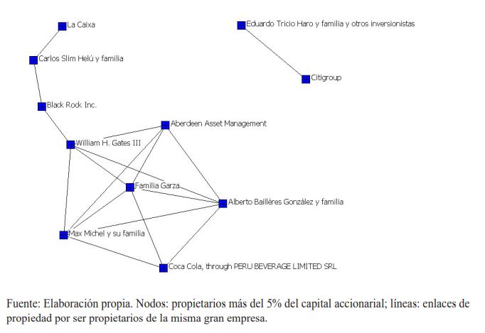 En este estudio de la red de propietarios de las grandes compañías mexicanas se mostró que realmente pocos propietarios comparten empresas entre sí. Así pues, la red de enlaces de propiedad se considera menos unida que la red de interlocking directoral. En ese sentido, se concluye que, “solo 11 propietarios invierten en varias de las grandes empresas. De estos 11 propietarios múltiples, 6 son empresas o individuos de origen extranjero, lo que implica que se produce una conexión entre la clase propietaria mexicana gracias a los inversionistas extranjeros”, (Aragón Falomir y Cárdenas, 2020).