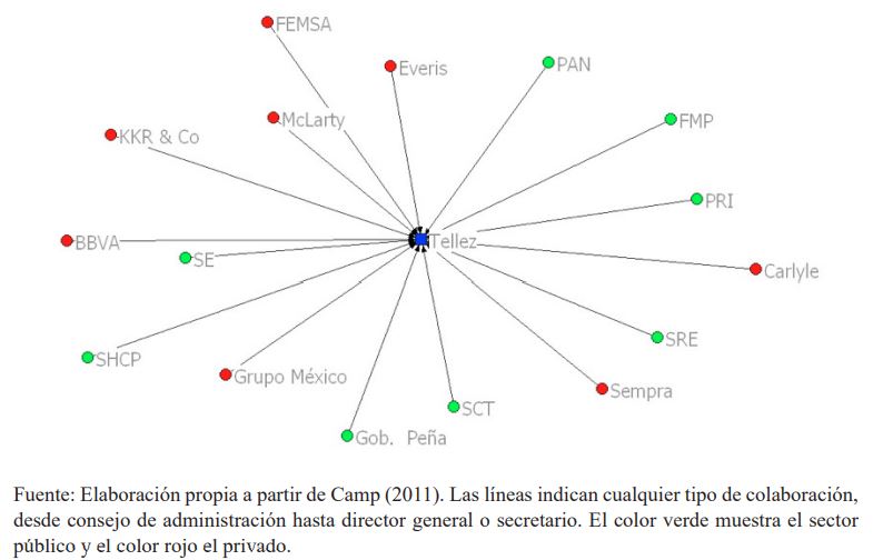 Otra red relevante a destacar es la que se formó alrededor de Luis Téllez Kuenzler. Su trayectoria fue la siguiente: de 1988 a 1990 fue tesorero de la SHCP, de 1991 a 1994 fue asistente en el Ministerio de Agricultura, de 1994 a 1997 fue jefe de la oficina presidencial y de 1997 a 2000 fue Ministro de Economía con el PRI como partido gobernante. Después, Téllez dio un salto del sector público al sector privado cuando trabajó en la firma estadounidense privada de capitales de inversión Carlyle Group de 2003 a 2006. Empero, en 2006 regresó al sector público y fue ministro de la SCT hasta 2009, con el PAN como partido gobernante. Asimismo, en 2006 Téllez fue elegido director de la consultora Sempra Energy del sector energético, (Dato crucial 1).