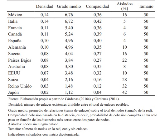 Conviene señalar que, la gran parte de las 50 mayores empresas mexicanas que seleccionaron los autores se encuentran vinculadas entre sí al compartir miembros del consejo de administración. Así, en la primera figura del texto puede verse la red empresarial, en la que los nodos son las empresas y las líneas los directivos compartidos, (Figua 1). Este análisis se creó con el fin de comprender el nivel de unión de las empresas mexicanas por sus élites empresariales. Pero, para profundizar aún más en este nivel de cohesión de red empresarial mexicana, se hizo una comparación con investigaciones anteriores que usaron un método parecido. De esta forma, en la primera tabla del texto se vislumbra que los números más altos de unión en ciertos países se tratan de la red corporativa mexicana, (Tabla 1).