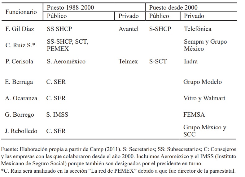 En cuanto a la red empresarial y política que se creó en PEMEX, un estudio de los antiguos directores de esta empresa paraestatal mexicana, muestra que se trata de un sector en el que las puertas giratorias son constantes. Conviene subrayar que, algunos directores de PEMEX estuvieron relacionados con compañías privadas del sector energético (petrolero y minero) durante el mandato del PRI o del PAN, (Tabla 3).