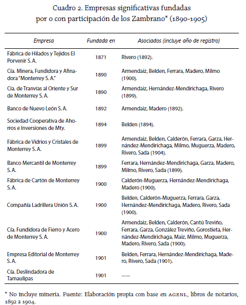 La familia Zambrano incursionó en diversos sectores y participó en una multiplicidad de empresas, entre las que destacan Cementos Mexicanos (Cemex) y Proeza. Ambas empresas son analizadas porque se trata de dos proyectos empresariales aún vigentes; porque superaron los años de la industrialización protegida y la posterior apertura; porque ambas ofrecen mecanismos diferentes de adaptación y crecimiento ante el escenario global; porque ambas presentan momentos de auge y crisis; y, porque permiten observar el protagonismo de miembros distinguidos de la familia Zambrano.