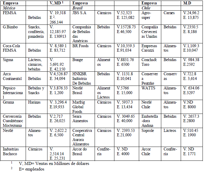 Las empresas más grandes en el mundo tienen presencia en gran cantidad de países, se presenta a continuación una lista de las 10 más grandes: 1) Unilever (Reino Unido - Holanda), 2) Nestlé (Suiza), 3) Coca Cola Company (Estados Unidos), 4) Kellog´s Company (Estados Unidos) 5) Mars (Estados Unidos), 6) PepsiCo. Inc. (Estados Unidos), 7) Mendelez International (Estados Unidos), 8) General Mills (Estados Unidos), 9) Associated British Food (Inglaterra), 10) Danone (Francia).