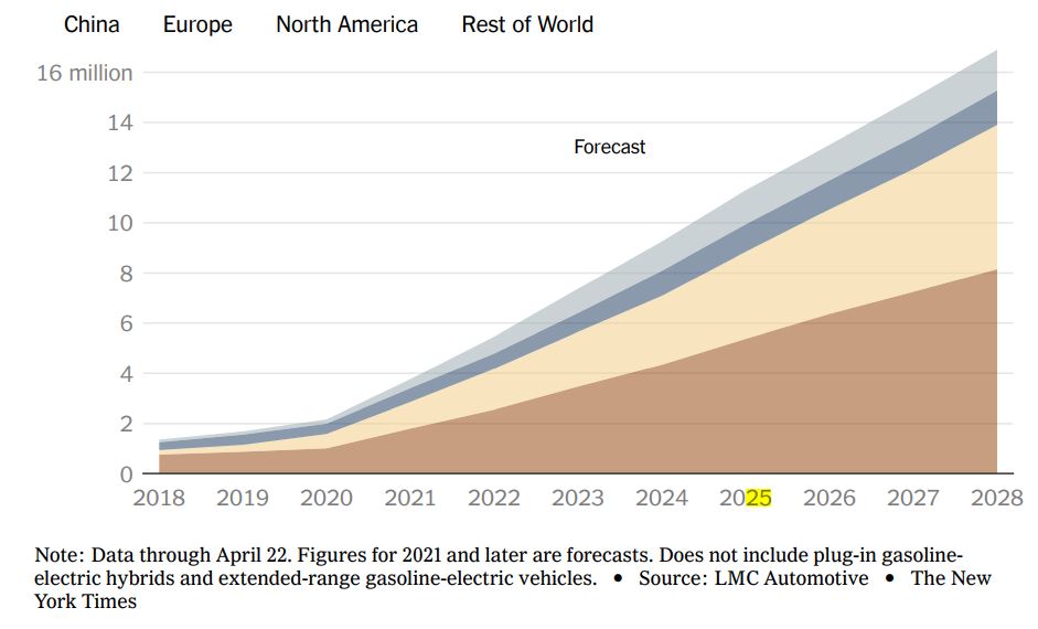China está construyendo fábricas de auto eléctricos casi al mismo ritmo que el resto del mundo. Así para 2028, fabricará más de ocho millones de coches eléctricos, según LMC Automotive, una empresa de datos global. Europa podría producir 5.7 millones y Estados Unidos 1.4 millones. Por otro lado, un elemento importante es el enorme mercado interno de China para los autos eléctricos.