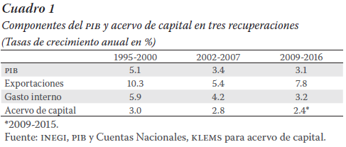 La tercera hipótesis para explicar el lento crecimiento económico reciente, considerada por el autor como la más natural, se refiere al gasto interno. Como muestra el cuadro 1, la tasa de crecimiento anual del gasto interno en las tres últimas recuperaciones ha disminuido gradualmente. La caída del gasto interno afecta a todos sus componentes, públicos y privados. La inversión pública ha disminuido 5.9% anualmente en el periodo reciente, lo que representa un colapso de 35% entre 2009 y 2016; esto llevó a que la inversión pública como porcentaje del PIB disminuyera de 5.9% a 3.1%. La política de inversión pública adoptó una postura ultra restrictiva.