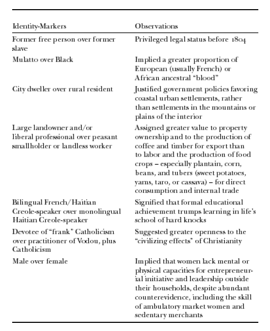 Así, Woodson realiza una descripción del desarrollo histórico de Haití. Comenzando por la independencia del país, el autor establece que este proceso, aunque acabó con la esclavitud, el colonialismo y el racismo simultáneamente, impuso, al interior de Haití, un sistema jerárquico orientado a la exportación y a los privilegios de las minorías. Woodson remarca que, para entender a Haití, es esencial entender esta jerarquía compuesta por siete marcadores de identidad (ver tabla 1).