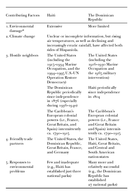 Sin embargo, el autor considera que más allá de los errores en los hechos, lo que es grave en el análisis de Diamond es su descontextualización y extrapolación de los hechos. Por ejemplo, para explicar las causas del colapso social, Diamond propone un marco comparativo de cinco puntos entre Haití y República Dominicana, en el que vincula el daño ambiental con el cambio climático, los vecinos hostiles, los socios comerciales amigables y las respuestas a los problemas ambientales (ver tabla 2). Aquí, Woodson argumenta que, al compartir una isla, tanto Haití como República Dominicana han sido vecinos hostiles o socios comerciales amigables a lo largo del tiempo, por lo que estos dos puntos requieren de una mayor elaboración en el esquema de Diamond. Lo mismo sucede en la relación de ambos países con Estados Unidos.