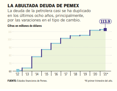 2. La deuda de Pemex aumentó 7% en el primer trimestre del año en comparación con el mismo periodo en 2020.