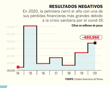 3. La petrolera cerró el año 2020 con una de las peores crisis, con pérdidas de casi 481 000 millones de pesos, la cual fue impulsada por la variación en el tipo de cambio. En el primer trimestre del año 2021, se reportaron pérdidas de 37 357 millones de pesos.