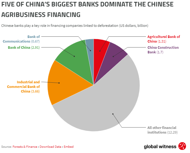 4. Cinco de los mayores bancos comerciales chinos: Banco Industrial y Comercial de China, el Banco de China, el Banco de Comunicaciones, el Banco Agrícola de China y el Banco de Construcción de China; proporcionaron 10.25 mil millones de dólares estadounidenses durante más de siete años a partir de 2013, lo que representa 45% de todo el financiamiento proporcionado por las instituciones financieras chinas. Cada uno proporcionó, respectivamente, 366 mil millones de dólares y 291 mil millones de dólares de financiación para las principales empresas que producen y comercializan productos básicos de riesgo forestal entre enero de 2013 y abril de 2020.