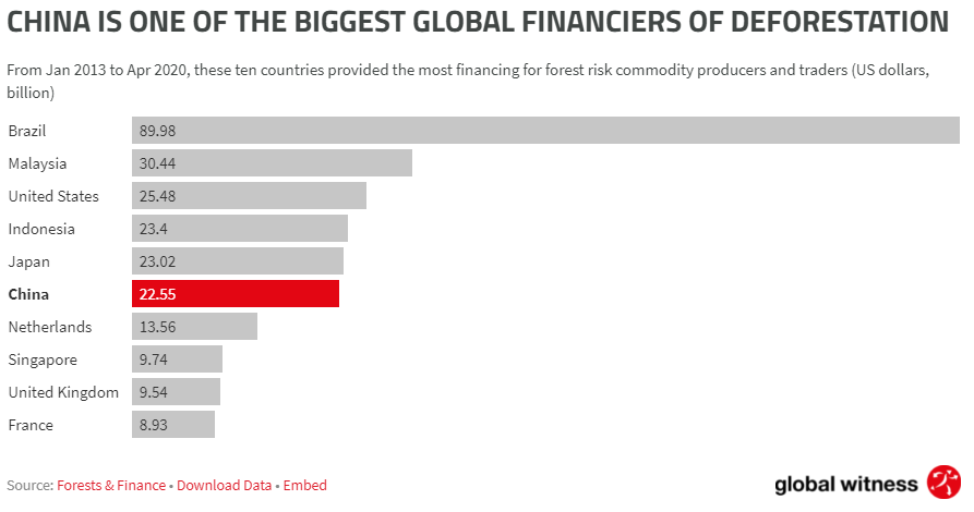 2. Un análisis basado en datos públicos de Forest and Finance https://forestsandfinance.org/data/ indica que los bancos e inversores chinos proporcionaron préstamos y suscripciones de más de 22 500 millones de dólares estadounidenses desde enero de 2013 hasta abril de 2020 a las principales empresas que producen y comercializan productos básicos de riesgo forestal. Los datos también muestran que, las instituciones financieras con sede en Brasil, Malasia, Estados Unidos e Indonesia (principales productores de dicho producto), proporcionaron la mayor cantidad de financiamiento. Sin embargo, si excluimos a los financieros basados en países productores, China ocupa el segundo lugar en el mundo financiero, después de Japón.