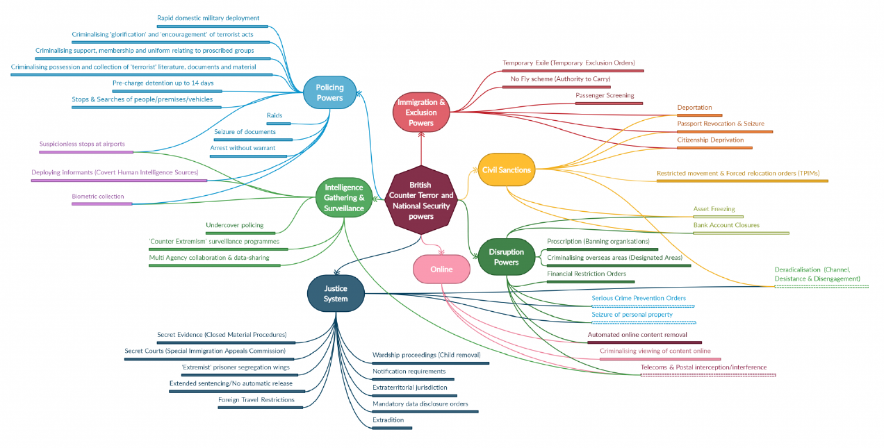 2- El mapa 1 muestra los poderes disponibles para los propósitos de lucha contra el terrorismo y la seguridad nacional en Gran Bretaña (se excluyen aquellos concedidos a través de Tratados Internacionales)].