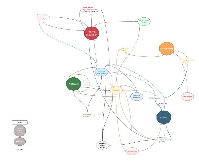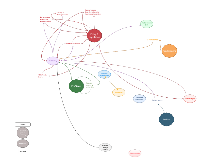La lucha contra el terrorismo en Gran Bretaña es impulsada por la relación mutua entre órganos, políticas de securitización, legislaciones, poderes beneficiados y practicantes. Estos agentes están mediados por una serie de “nodos”, como los medios de comunicación, las relaciones públicas, organizaciones de cabildeo, thinktanks, grupos de investigación académicos y diversas fuentes de financiamiento. Todos estos elementos son centrales para ampliar y reproducir las políticas de securitización.