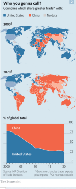 Biden ha trabajado con el G7 y el Quad, una agrupación militar con Australia, Japón e India para contrarrestar la diplomacia de vacunas sujetas a condiciones chinas. Los aliados de Estados Unidos no actuarán por sí solos sin ayuda de la potencia americana. Boris Johnson anunció el 7 de julio de 2021 que no quería ahuyentar la inversión debido un “espíritu anti-China”. El número de países con los que China comparte más comercio que Estados Unidos es mayor que al revés.