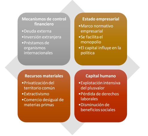 Por otra parte, los mecanismos de control financiero y el Estado empresarial, legitiman y promueven “las condiciones necesarias para ejecutar una usurpación y despojo intensivo de los bienes naturales sin preocuparse por la respuesta social o las demandas de respeto a la soberanía de las naciones” (p. 86).