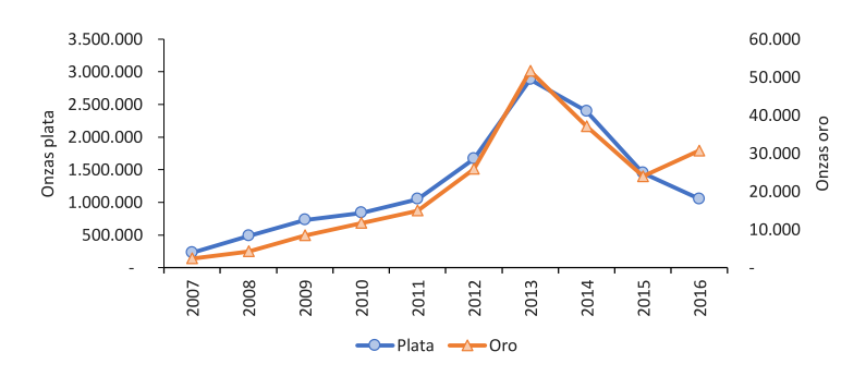 El crecimiento productivo de oro y plata se mantuvo hasta que en 2013 comenzó un lento declive. De acuerdo con Azamar, este comportamiento está relacionado con factores externos como la caída en los precios de los minerales y la disminución en su demanda por parte de Asia. Cabe destacar que la totalidad de la producción es exportada hacia Corea del Sur para la creación de productos de alta tecnología.