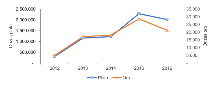 Producción anual de onzas de plata y oro en la unidad el Cubo, 2007- 2016