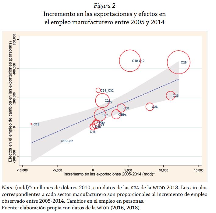 Entre 2005 y 2014, las exportaciones tuvieron un efecto positivo de 37 millones de empleos: 67.2% se asocia a las exportaciones dirigidas a Estados Unidos y sólo 2.65% a las destinadas a China. En el empleo manufacturero se generaron 2.2 millones de empleos como efecto de las exportaciones, 63.7% corresponde a exportaciones hacia Estados Unidos y sólo 3.4% se asocian con exportaciones a China.