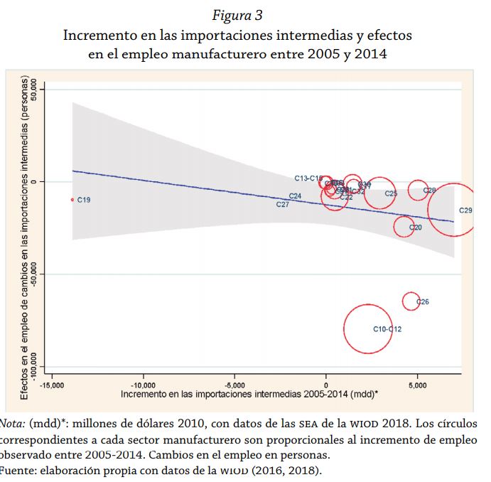 En la figura 3 se muestra que a mayor incremento de las importaciones intermedias son mayores los efectos negativos en el empleo, con excepción de fabricación de productos textiles, prendas de vestir y productos de cuero, en el caso de estas tres industrias, la reducción de sus importaciones intermedias significó un efecto positivo en el empleo.