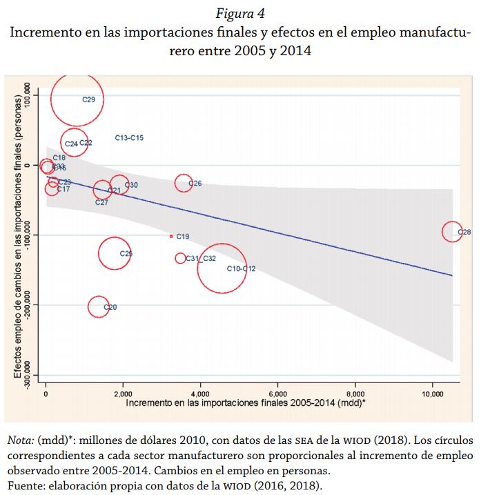 Entre 2005 y 2014, las importaciones finales generaron un efecto negativo en el empleo de -1.3 millones de empleos, 36.3% corresponden a importaciones finales de China y 31.1% a importaciones provenientes de Estados Unidos.