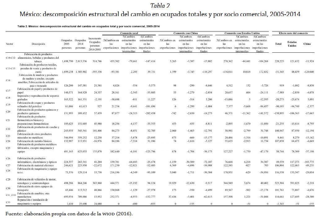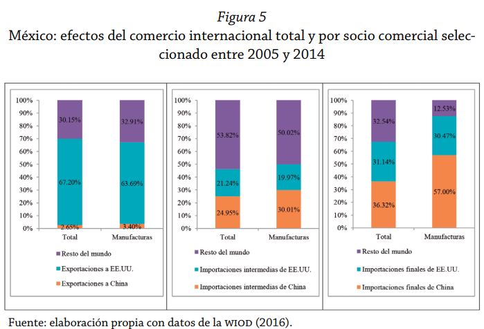En México, “al efecto neto positivo de un mayor comercio con Estados Unidos hay que descontar el efecto neto negativo que predomina en el comercio con China. Por tanto, a un mayor comercio con Estados Unidos (principalmente más exportaciones) no pueden asociarse solo efectos positivos en el empleo en México porque se requiere tener en cuenta las interrelaciones productivas y comerciales con ésa y otras economías” (p. 107).
