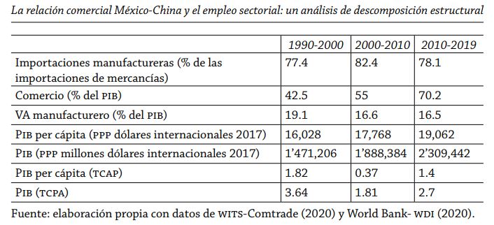 La apertura comercial que fue establecida con Estados Unidos desde la década de 1980, con el modelo neoliberal, en los últimos años ha sido susceptible del ascenso de China como potencia económica. Sin embargo, la relación comercial con China aún no ha modificado estructuralmente el empleo en México, apenas influye sobré el mismo. Cabe destacar que a pesar de los empleos que se generan derivados de las exportaciones manufactureras, la creación de puestos de trabajo depende en gran medida de la demanda externa, sin mencionar que el valor agregado de las manufacturas se encuentra restringido por las segmentación de los procesos productivos.