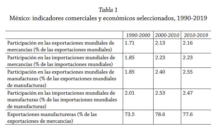 A partir de la década de 1980, la economía mexicana ha experimentado un proceso acelerado de apertura comercial, desregulación y sustitución del gobierno por el mercado en la asignación de recursos. En este contexto, el crecimiento será liderado por las exportaciones, específicamente las manufacturas, al mismo tiempo que se relega el mercado interno. Con el ascenso de China en la economía internacional a principios del siglo XXI, México ha ganado un nuevo competidor y ha aumentado su dependencia a las importaciones.