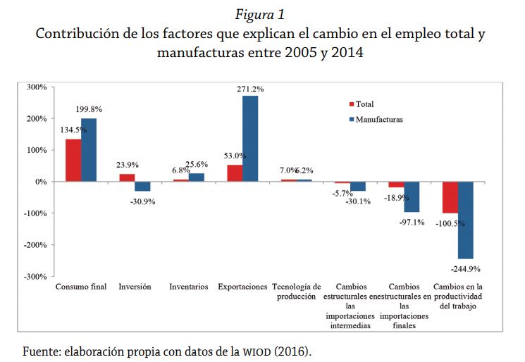 Para toda la economía, de 2005 a 2014, el consumo final generó 9.3 millones de empleos (mde) o contribuyó en 134.5% en el cambio del empleo, la inversión 1.65 mde (23.9% del cambio en el empleo), las exportaciones 3.3 mde (53%) y los cambios en la tecnología de producción 482 mil empleos (7%). Asimismo, los factores con efecto negativo sobre el empleo fueron los cambios en la productividad del trabajo (-100.5%), los cambios estructurales en las importaciones intermedias (-5.7%) y los cambios estructurales en las importaciones finales (-18.9%).
