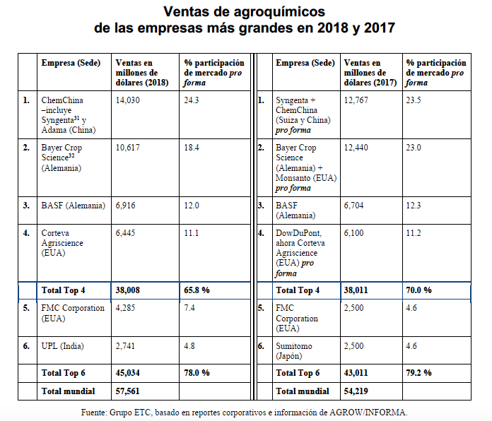 Debido a las recientes fusiones, los “seis grandes” de la industria agroquímica se convirtieron en cuatro; empresas que también son importantes vendedoras de semillas (ver dato crucial 3). En 2017, controlaban 70% de las ventas de agroquímicos y dos tercios de las de semillas comerciales en el mundo.