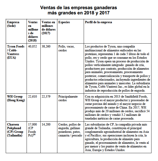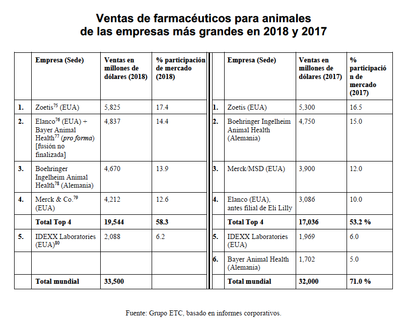 Las ventas mundiales de productos de salud mundial llegaron a 33.5 mil millones de dólares en 2018. “Todas las empresas veterinarias de primera línea son filiales o derivados de Big Pharma” (p. 15) y los cinco principales fabricantes de medicamentos para animales (Zoetis, Boerhringer Ingelheim, Merck, Elanco y Bayer) representan casi dos tercios del mercado.