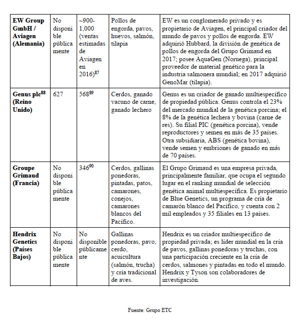 Actualmente, las 3 principales empresas controlan todo el ganado avícola del mundo y casi la mitad (47%) del mercado de genética porcina comercial.
