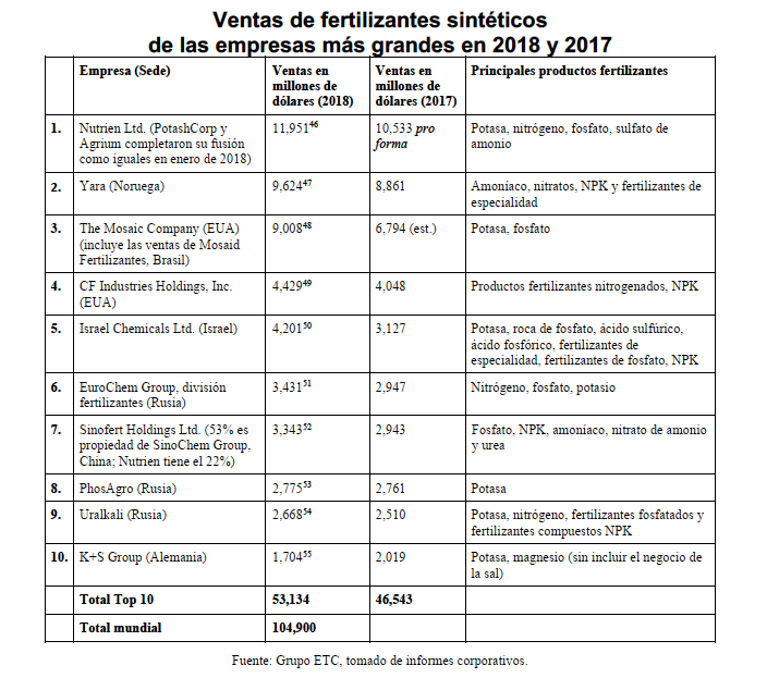 En 2018, el mercado mundial de fertilizantes sintéticos contabilizó casi 105 mil millones de dólares. Sólo dos empresas abastecen a todo el mercado norteamericano de potasa y tres productores suministran una cuarta parte de fertilizantes fosfatados a nivel mundial.