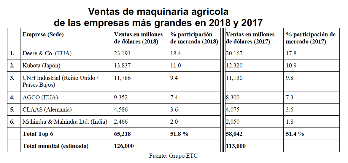 En este sector, las 6 empresas más grandes representan 52% del mercado mundial y el mercado norteamericano destaca como el más consolidado. Deere, CNH y AGCO controlan 95% del mercado de tractores y la totalidad del mercado de cosechadoras en Norteamérica. El valor de este sector fue de 126 mil millones de dólares en 2018. Por otro lado, las tecnologías de hardware y software relacionadas con la agricultura de precisión representan únicamente 5% del mercado mundial, aunque se espera que esta cifra aumente rápidamente.