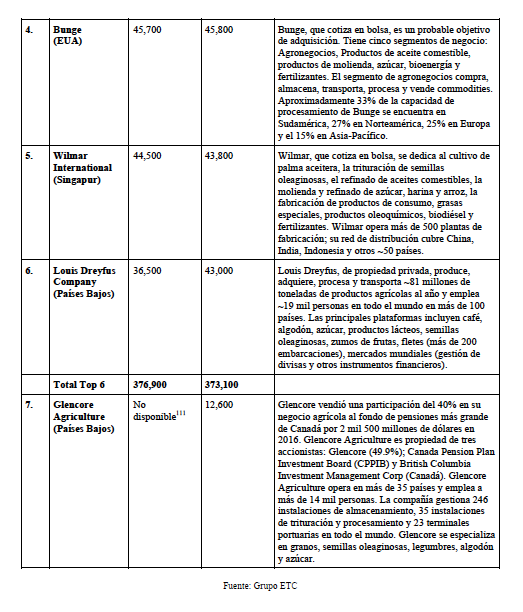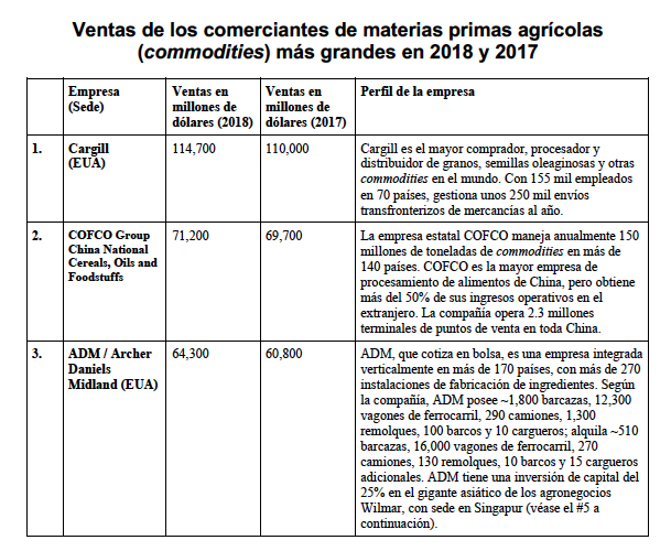 Los ingresos de los seis principales comerciantes de materia prima agrícola en 2018 (377 mil millones de dólares) superaron en gran medida a la suma de los mercados mundiales de semillas, plaguicidas, maquinaria agrícola y fertilizantes (295 mil millones de dólares). En este mismo año, los ingresos de la mayor empresa de este sector (Cargill con 115 mil millones de dólares) superaron a las ventas mundiales de todo el mercado de maquinaria agrícola.