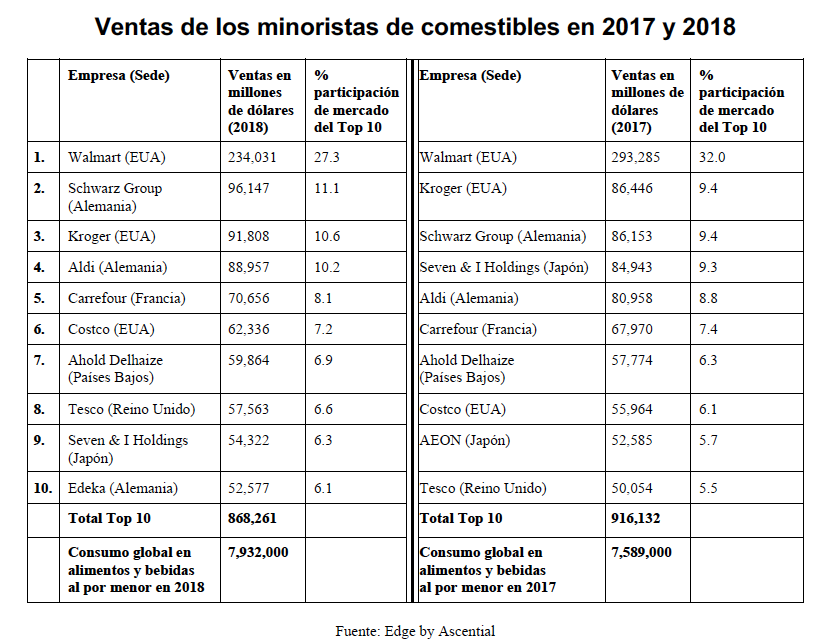 El gasto de los consumidores minoristas de alimentos y bebidas fue de 7.9 billones de dólares en 2017. Los 10 principales comerciantes de este sector controlan aproximadamente 11% del mercado mundial; de la suma de sus ingresos, los de Walmart representan 27%, lo que lo posiciona, por mucho, a la delantera del grupo.