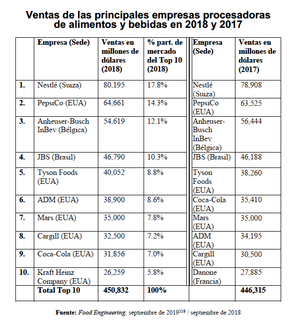 Las ventas de los 10 mayores productores de este sector superaron 450 mil millones de dólares en 2018, un pequeño aumento en contraste con las ventas del 2017, pero que supera el declive de los cuatro años anteriores. Los cinco principales actores ocupan los mismos puestos, mientras hubo cambios en los cinco menores. Kraft Heinz derrotó a Danone y de esta forma regresó al Top 10.