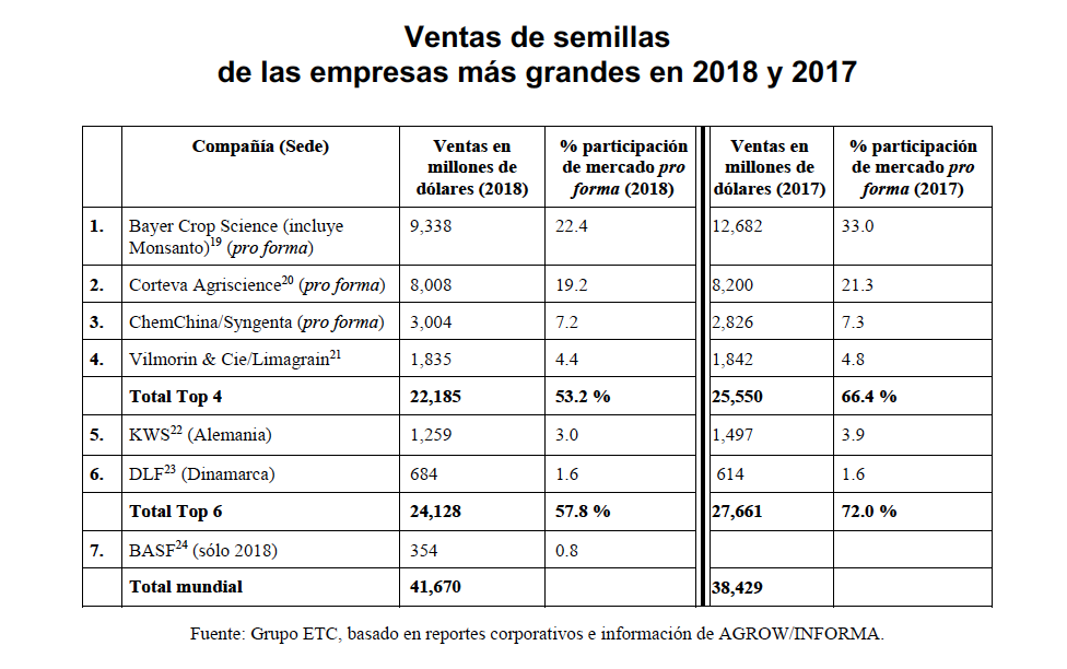 El valor del mercado mundial de semillas de cultivos comercializados fue de 41 mil 670 millones de dólares en 2018, aumentando 1.3% respecto al año pasado. Mientras en 2017 las cuatro empresas más grandes de semillas comerciales del mundo controlaban dos tercios de este mercado, en 2018 seis empresas acapararon 58% del mercado. Asimismo, 6 empresas controlaban 72% del mercado mundial de semillas en 2017 y, al siguiente año, 3 empresas representaron 49% del mismo.