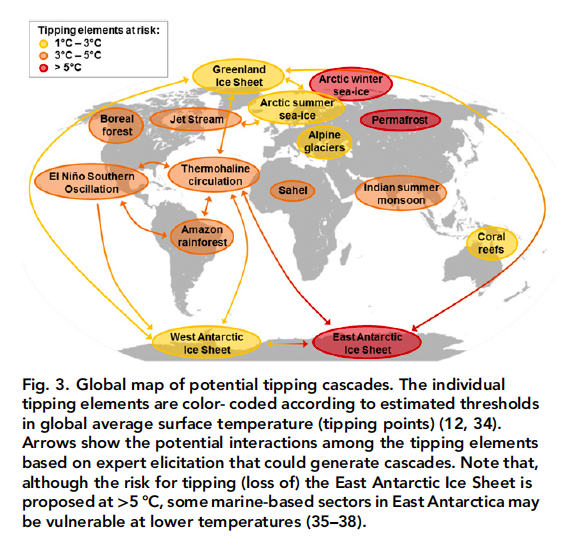 Puntos de inflexión en cascada. La figura 3 muestra un mapa global de algunos de los potenciales puntos de inflexión en cascada. Los puntos están categorizados por sus temperaturas límites. El efecto cascada podría desencadenarse cuando los elementos cuyos umbrales requieren de cambios más bajos en temperatura se activen –aquellos señalados en color amarillo–. El rebasamiento de estos puntos de inflexión aumentaría aún más la temperatura del planeta y, por lo tanto, activaría a los elementos marcados en rojo y naranja.