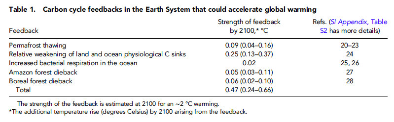 El análisis aquí presentado se centra en la fortaleza de las retroalimentaciones desde ahora hasta 2100. Sin embargo, muchas de las retroalimentaciones que se espera sean pequeñas en 2100 podrían desatarse desde antes y, de esta manera, generar una fuerza significativa que influya en la trayectoria de largo término de la trayectoria del Sistema Tierra (entre los procesos de retroalimentación se encuentran: el deshielo del permafrost, la descomposición de los hidratos de metano del océano, el aumento de la respiración de las bacterias marinas y la pérdida de las capas de hielo polares; acompañada de un aumento en el nivel del mar y una posible amplificación de aumento de la temperatura a través de cambios en la circulación oceánica).