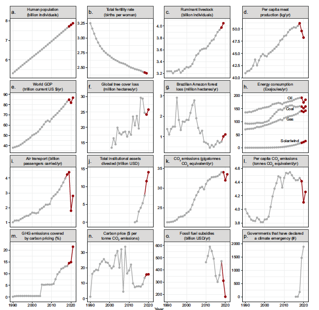 1. La figura 1 muestra series temporales de las actividades humanas globales relacionadas con el clima. En los paneles (a), (d), (e), (i) y (m), los datos más recientes se tratan de proyecciones; en el panel (f), la pérdida de cobertura arbórea no contabiliza la ganancia forestal e incluye la pérdida por cualquier causa.