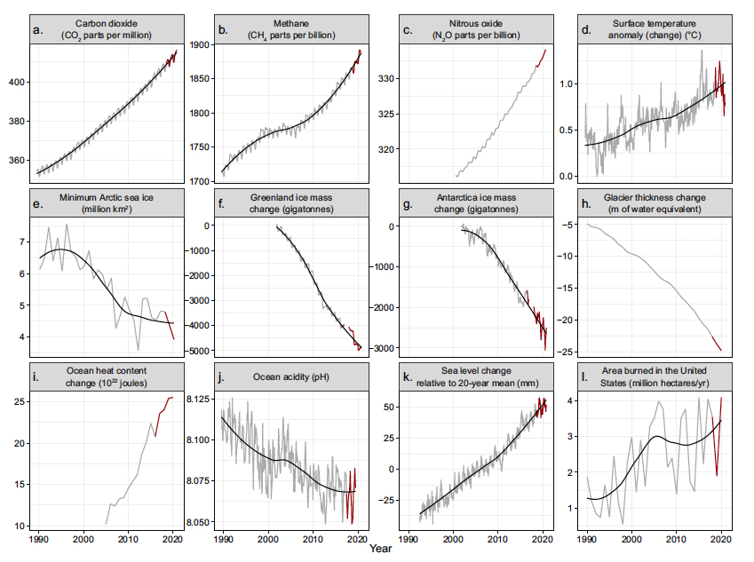 Gases de efecto invernadero y temperatura. En 2020 y 2021, la concentración atmosférica de tres importantes gases de efecto invernadero alcanzaron cifras récord. Se trata del dióxido, el metano y el óxido nitroso (ver figuras 2a-2c). Asimismo, “el año 2020 fue el segundo más caluroso registrado, y cinco de los años más calientes de los que se tenga registro han ocurrido desde 2015” (ver figuras 2d y S3d) (p. 3).