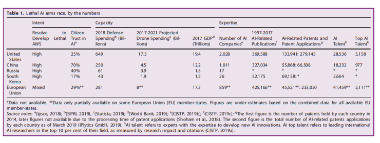 El desarrollo de armas letales en Estados Unidos, Rusia, China, Corea del Sur y la Unión Europea se examina a partir de tres componentes: los intentos específicos de cada país de desarrollar SSA, la capacidad general y el historial de cada actor con respecto al desarrollo de hardware de armas letales automatizadas de última generación, y el cultivo de los conocimientos de software de inteligencia artificial necesarios.