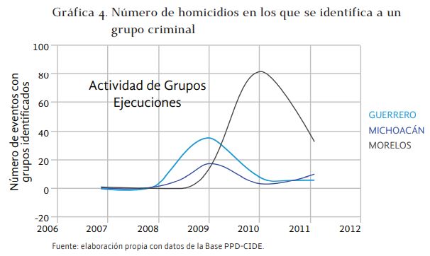 “Para observar si efectivamente la mayor diversidad y cantidad de grupos de crimen organizado se vincula con el aumento de la tasa de homicidios dolosos de drogas contamos con dos métodos” (p. 33). Por una parte, la base PPD-CIDE registra el nombre de la organización que, con alta probabilidad, pudo cometer la ejecución. La gráfica 4 señala el número de homicidios dolosos en los que, en efecto, se encontró un mensaje en el que se atribuía la ejecución a un grupo identificado como organización criminal vinculada al tráfico de drogas ilegales.