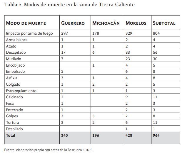 “Por otro lado, una forma más de vincular la mayor fragmentación de las organizaciones criminales con el aumento de homicidios de drogas en la región de Tierra caliente se da al observar el modo de muerte de los casos registrados” (p.35).