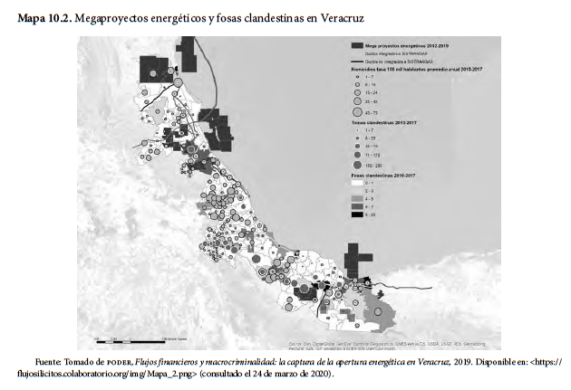 Además de su importancia en la producción de hidrocarburos, Veracruz se ha conformado como un territorio criminal, en donde los grupos delictivos, empresarios y políticos buscan “potencializar o maximizar la extracción de renta de forma legal e ilegal” (p. 261).