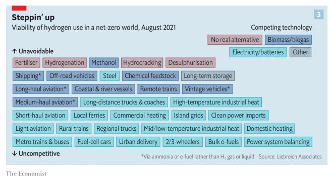 Michael Liebreich, un gurú de la energía limpia señala que, a medida que de las aplicaciones en las que el hidrógeno tiene de la electricidad renovable, se hace más difícil ver mercados serios para el gas. Para ilustrar su punto ha desarrollado una "escalera del hidrógeno" que clasifica usos, desde los indispensables hasta los inviables.