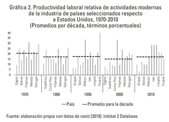 Al mismo tiempo en la gráfica 2 se observa de forma significativa una ampliación de la brecha entre los países seleccionados en la frontera tecnológica internacional, en términos de los niveles de productividad laboral relativa en las actividades modernas de la manufactura.