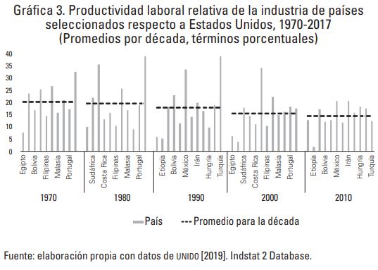 En promedio, la eficiencia en los casos seleccionados va de representar 20.2% de la de Estados Unidos en los años setenta, a 14.5% en el periodo 2000-2017.