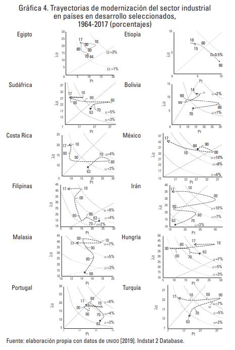 A excepción de Egipto, Hungría y México, todos los países de estudio muestran al inicio de sus trayectorias la necesidad de emprender un cambio estructural, es decir, de favorecer la migración del trabajo de sectores manufactureros de baja y media baja tecnología hacia los sectores modernos.