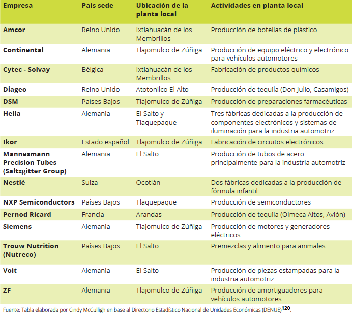 Actualmente se pueden ubicar al menos quince empresas de capital europeo con actividades manufactureras en la cuenca (ver tabla 1). Los datos sobre los vertidos de estas empresas son escasos o nulos. Sin embargo, las redes de alcantarillado en las que depositan sus residuos terminan en la planta de tratamiento El Ahogado, que en 2016 fue señalada de contener sustancias “altamente tóxicas” y cancerígenas. Estas sustancias no son controladas por la norma de descarga en México, mas sí lo son por las leyes europeas.