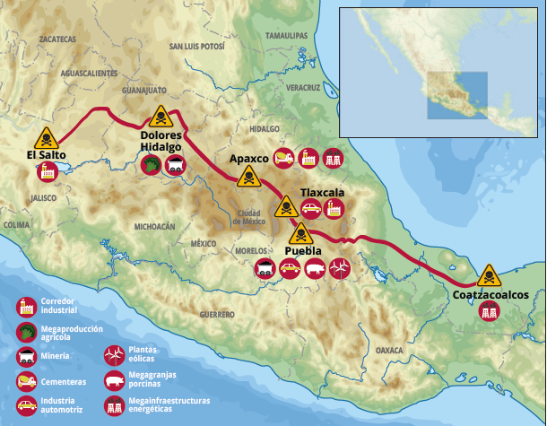 Las regiones recorridas por la Caravana se ubican en el Eje Neovolcánico, espacio con vastos recursos naturales y que se relaciona con los corredores urbanos-industriales del Plan de Desarrollo Nacional del presidente Ernesto Zedillo, que se establecieron en el marco de la firma del Tratado de Libre Comercio de América del Norte (TLCAN). En virtud de atraer inversiones, la implementación del libre comercio en México ocasionó desregulación ambiental, social y laboral. Así, capitales nacionales y transnacionales se instauraron a la par de “paraísos industriales”.